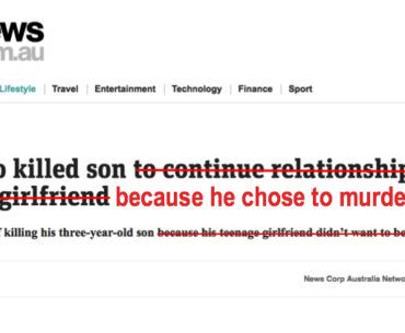 Habits die hard and victim-blaming attitudes are stubbornly persistent. Change is slow, but it is happening. I don’t see nearly as many “scorned lovers” or “good blokes” kill their partners and children. They’ve (mostly) stopped describing men who sexually abuse children has having “sexual relationships” with their victims.